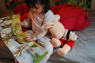 Rita一歲左右,她的姑姑清理了一些她表哥的童書給她,其中一本叫“The Very Hungry Caterpillar”(好餓的毛毛蟲),是一本非常可愛的小書,很簡單地一個毛毛蟲變蝴蝶的故事,插圖精美有趣,作者艾瑞卡爾(Eric Carle)很有創意地在毛毛蟲吃過的食物上都鑽了小洞洞,正好讓小小孩的手指鑽進去,所以Rita好喜歡這本書,總是 要我們一讀再讀, 百看不厭!